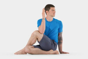 7- التمرين السابع : وضع الإلتواء الأيمن والأيسر ضع عقب القدم في أصل الفخذ كما تري في الصورة ولا تحرك عقب القدم من مكانه وإنحن يمينا وشمالا علي التوالي باليد والرجل المتبادلتين لمدة تتراوح بين 5 الي 15 ثانية يجب أن يكون العمود الفقري عموديا أثناء ممارسة هذا التمرين ،يساعد هذا التمرين في تنشيط الجهاز الهضمي وإزالة آلام الروماتيزم .